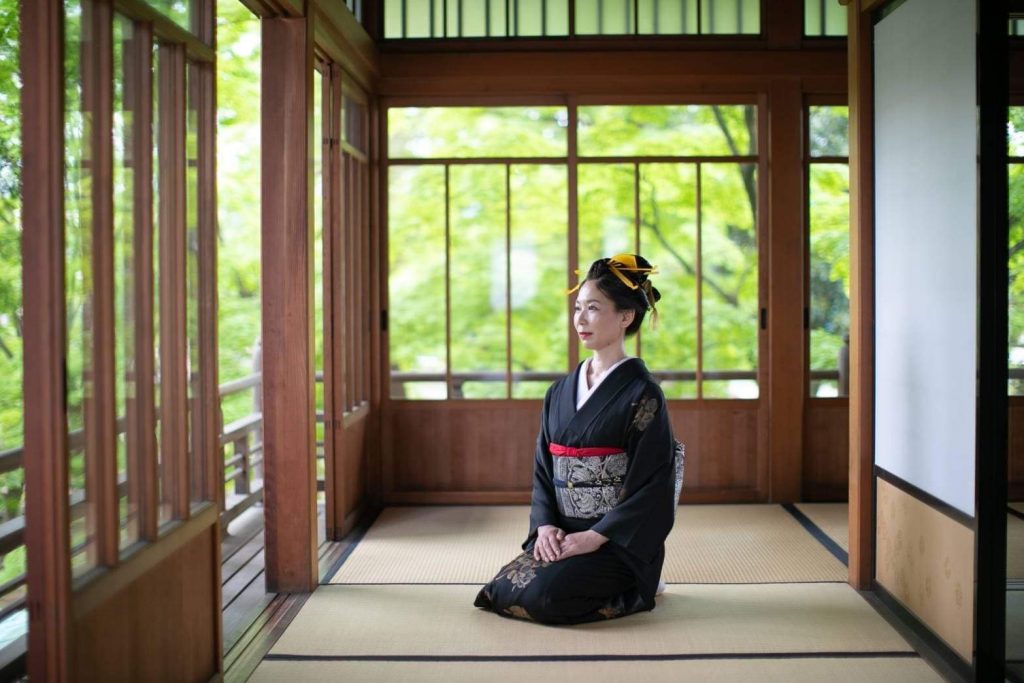 ▲日本髪に和服姿で庭の木々を眺める千枝子さん。自然と背筋が伸びる